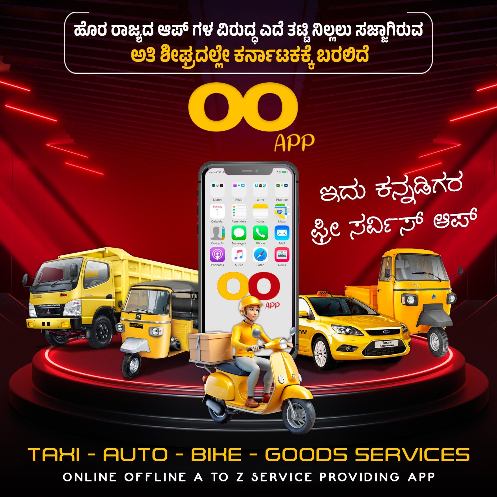 Welcome to OO App – Karnataka’s very own all-in-one transport and delivery solution! Launched with a vision to simplify urban mobility and logistics, OO App proudly connects users with a wide range of services including Taxi, Auto, Bike, and Goods Transportation, all through a single user-friendly platform.